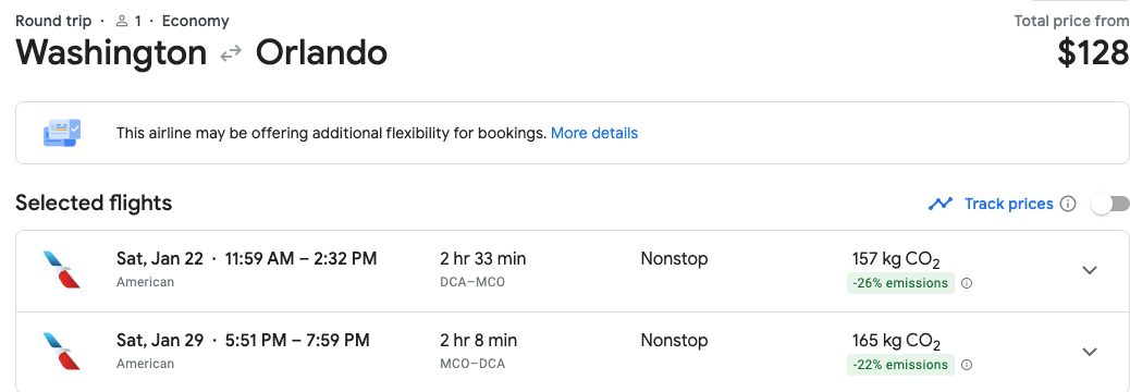 For those on the East Coast, there are a variety of flights available, including from DCA to MCO for just $128 round-trip via a nonstop flight on American Airlines.
