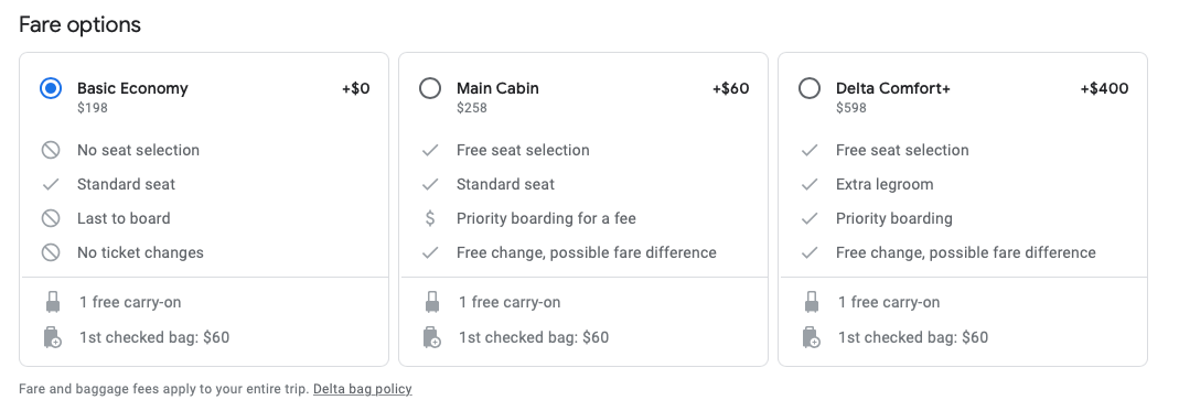You'll see that this is a nonstop flight in Delta's basic economy class, which includes one free carry-on but does not include seat selection or priority boarding.
