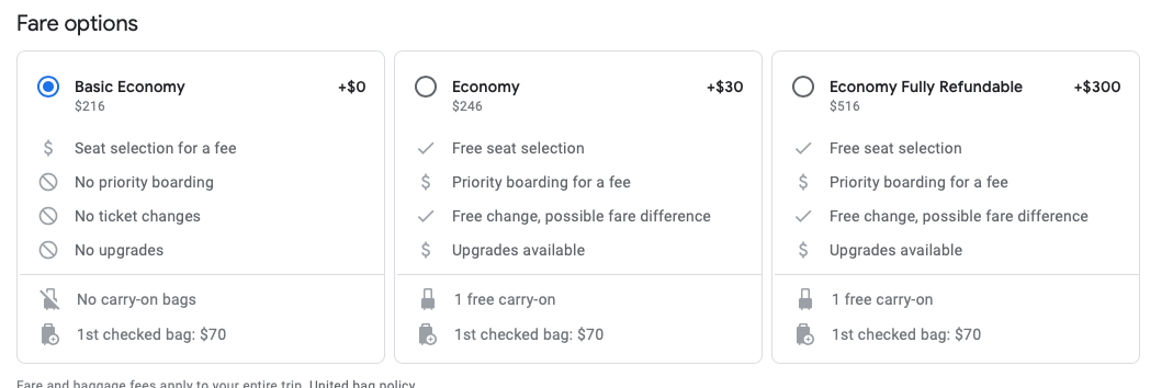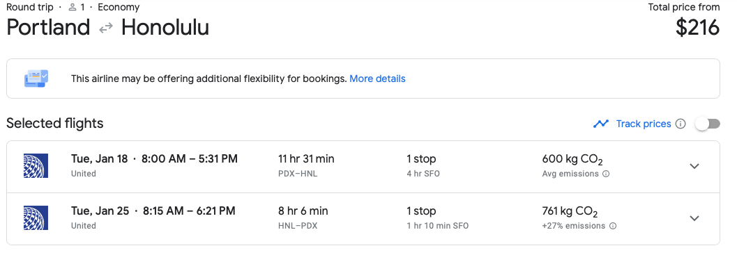 And finally, if you are a United loyalist or simply find their routes most suit your needs, see the below example round-trip flight from Portland to Honolulu for $216. Just know that United's basic economy class is the most restrictive among the bunch, with no free carry-on, seat selection, priority boarding or upgrades.