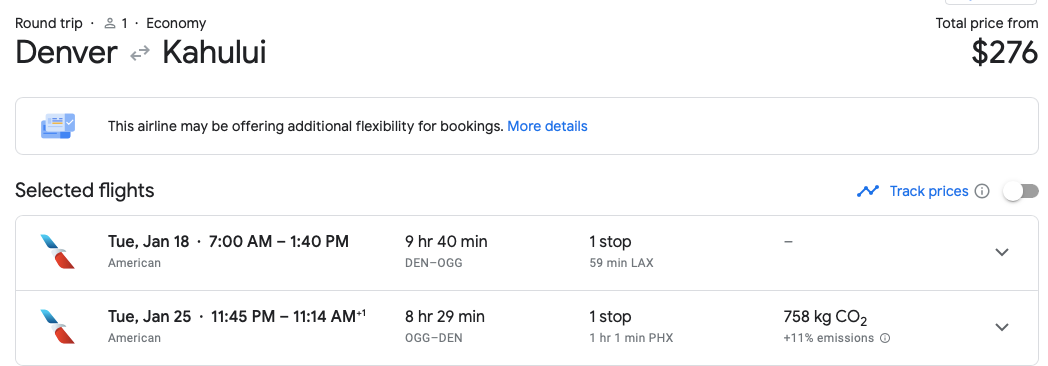 In conducting a test search, I also came across some American Airlines flights in this deal, like the below from Denver to Maui, also in basic economy.
