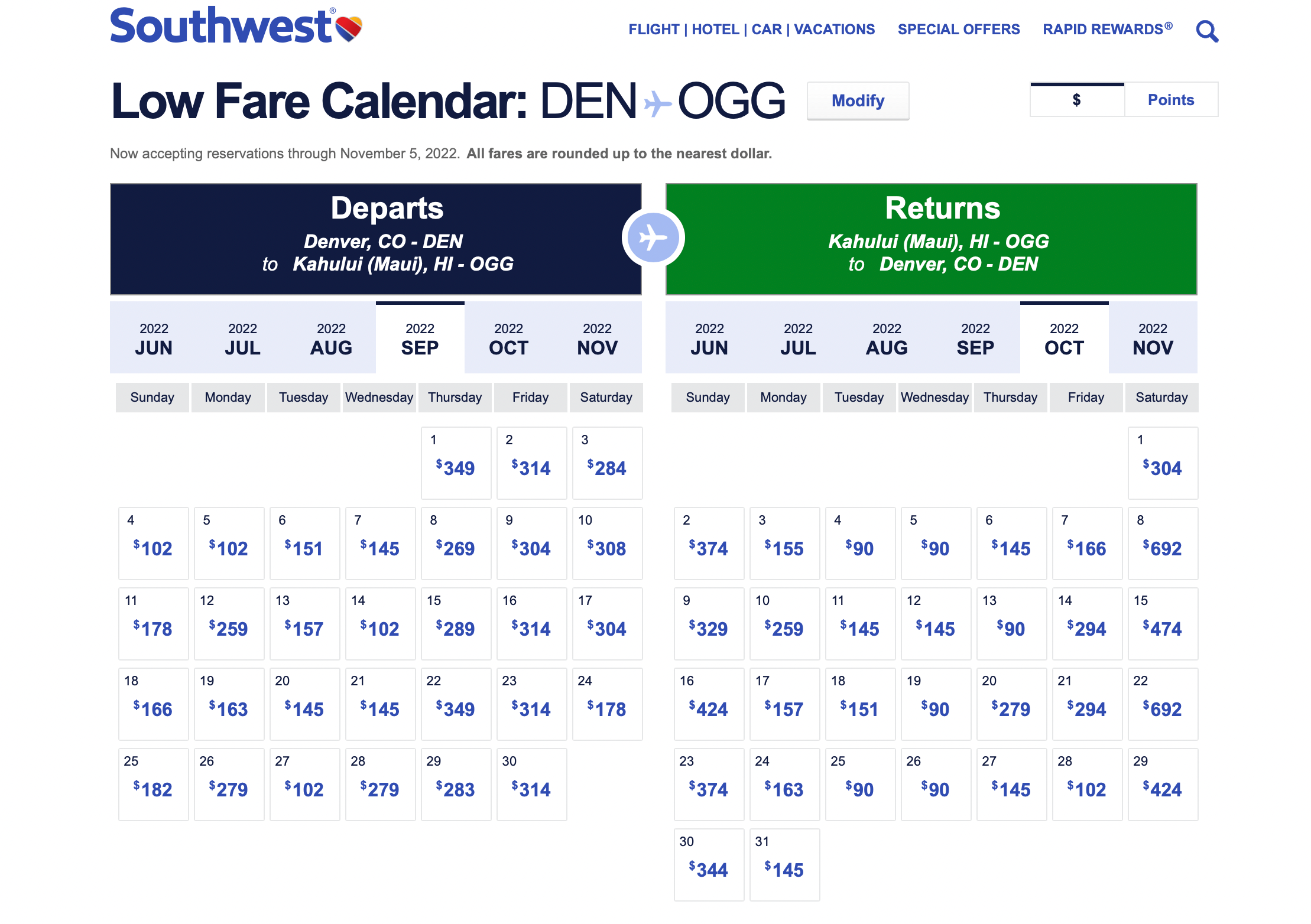 Travel dates: July to April on United, August to November on Southwest. Exact dates depend on the route.