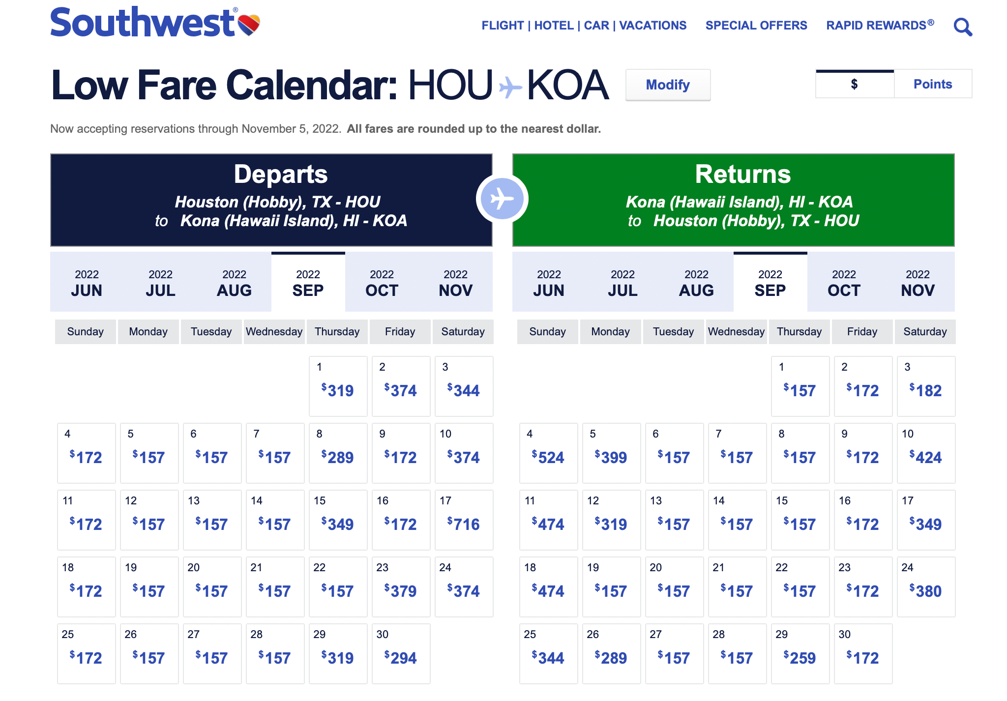 It's hard to beat this $314 round-trip deal from Houston to Kona on Southwest that offers a 61% savings on regular prices for September flights.