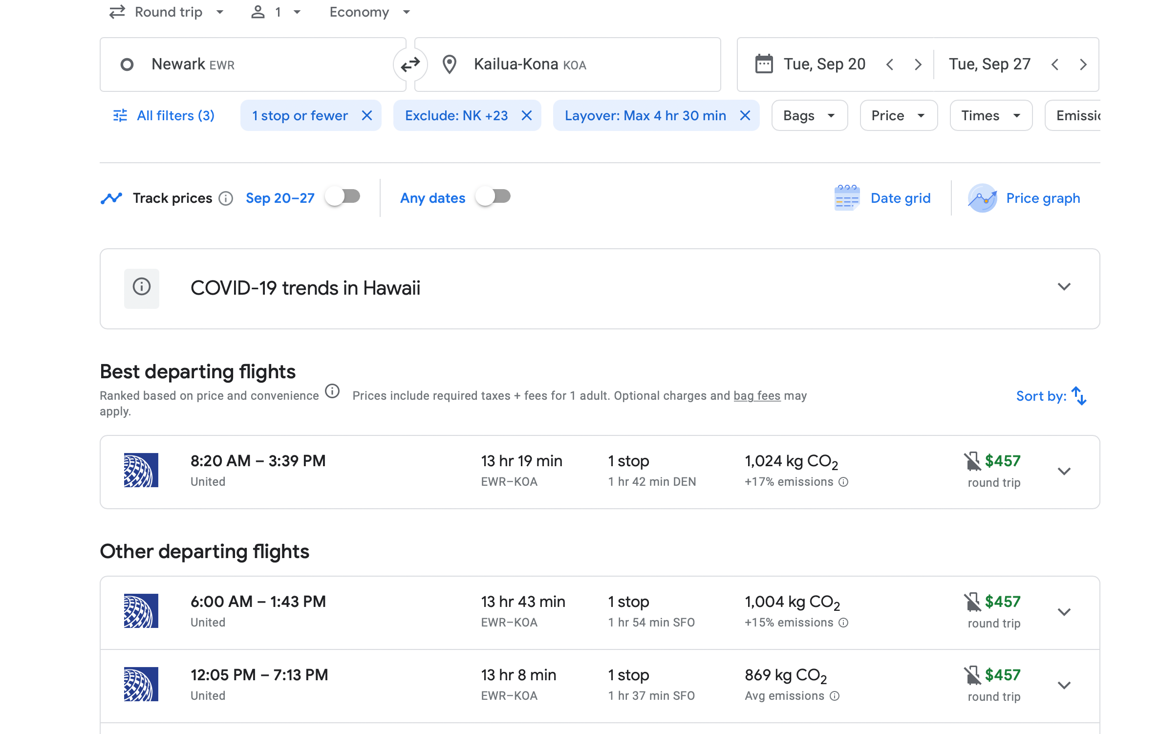 Prices from East Coast airports such as Newark Liberty International Airport (EWR) on United are nearly a 40% discount, with flights to Kailua-Kona averaging $497 as opposed to a regular price of $816. From Boston, fares are averaging $314 on Southwest, which is a savings of more than 60% -- even greater savings than their advertised 40% off sale.
