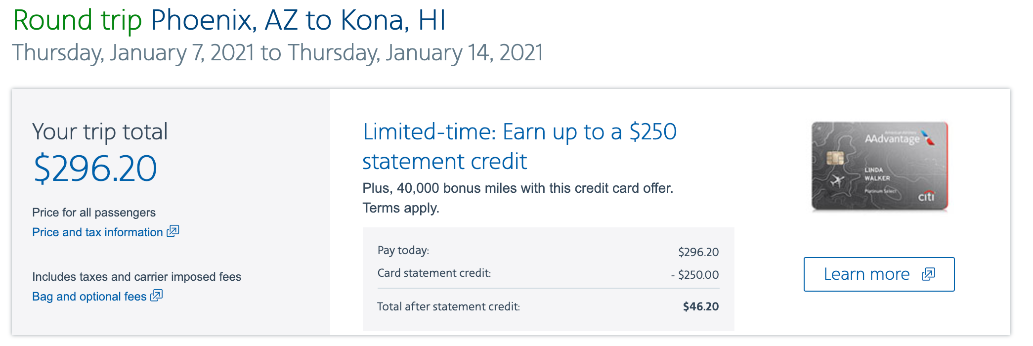 Phoenix (PHX) to Kona (KOA) for $296 round-trip nonstop on American Airlines: