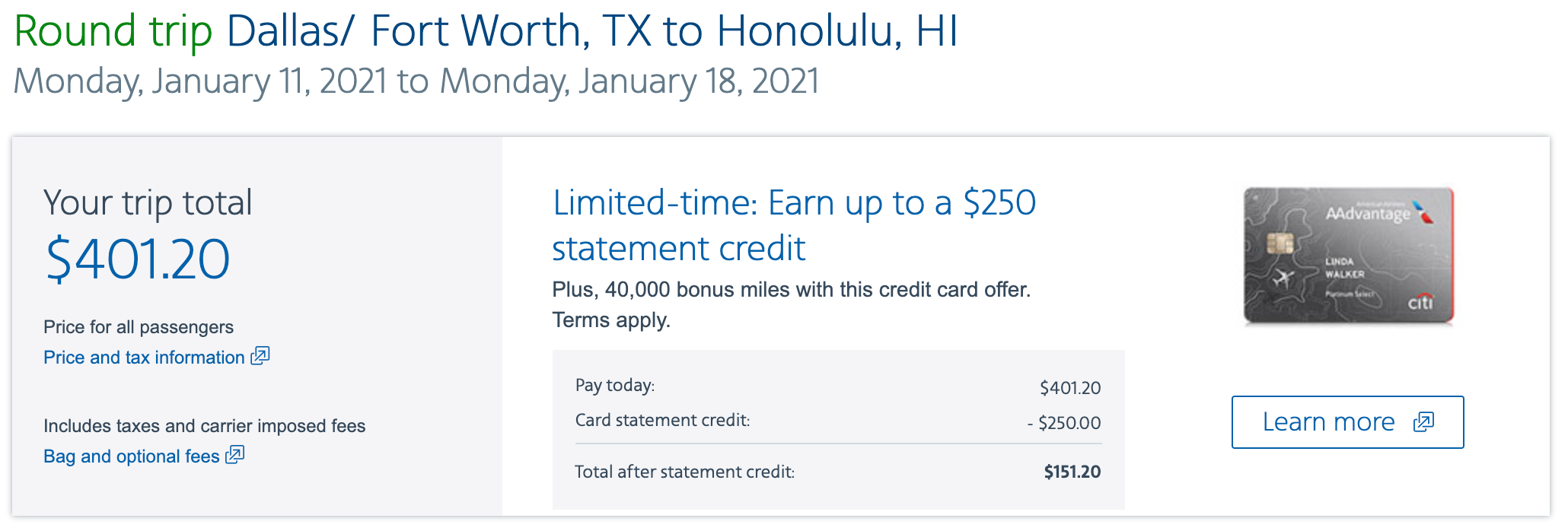 Dallas-Ft. Worth (DFW) to Honolulu (HNL) for $401 round-trip on American Airlines: