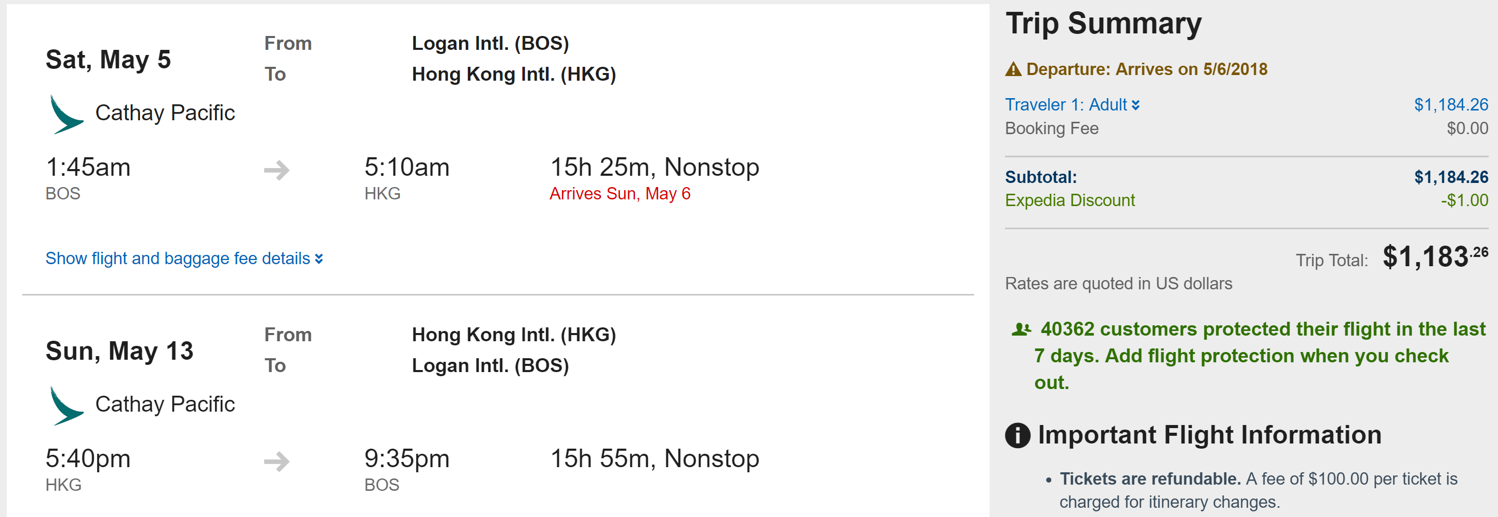 Boston (BOS) to Hong Kong (HKG) for $1,183 round-trip on Cathay Pacific in premium economy: