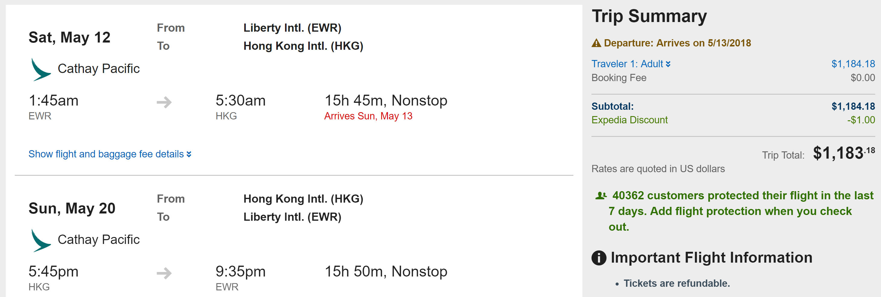 Newark (EWR) to Hong Kong (HKG) for $1,183 round-trip on Cathay Pacific premium economy: