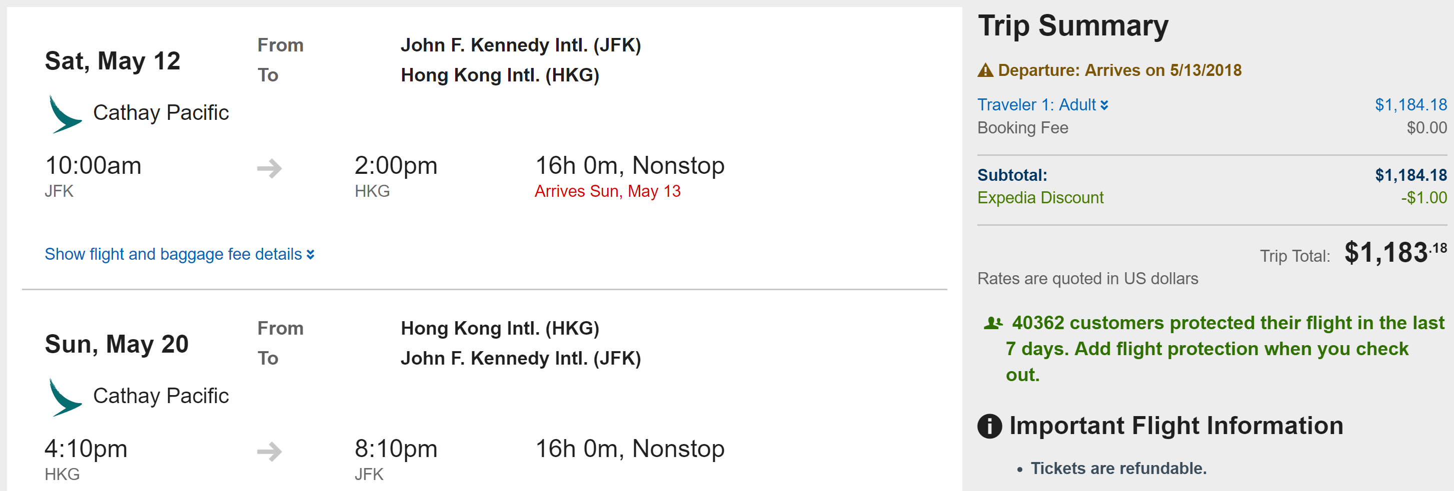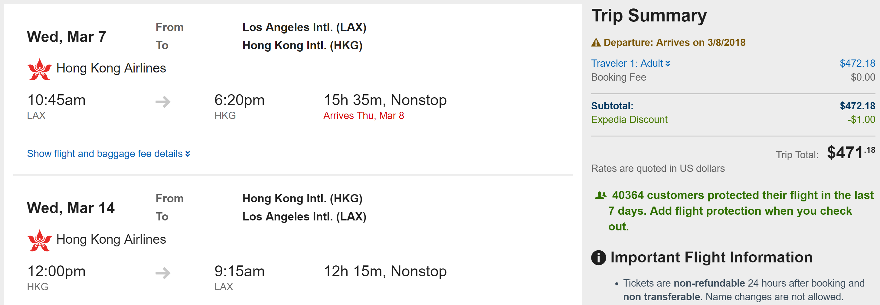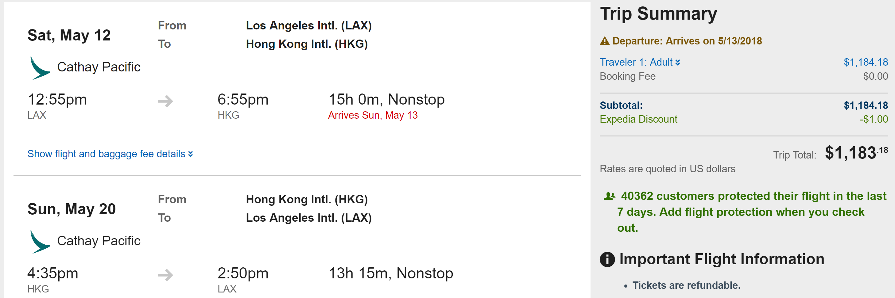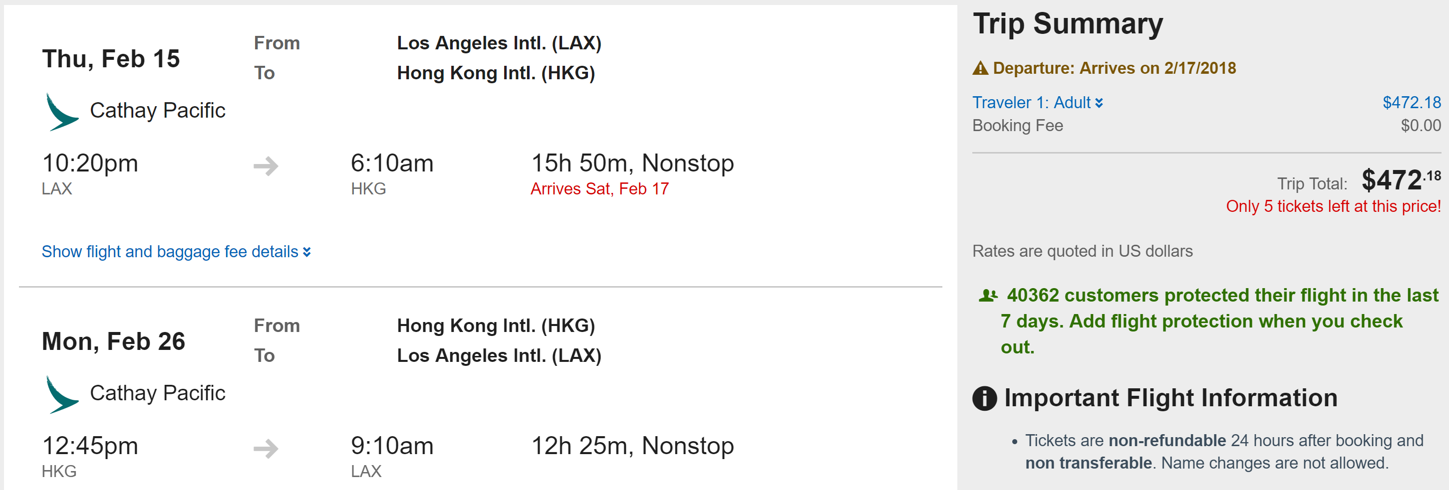 Los Angeles (LAX) to Hong Kong (HKG) for $472 round-trip on Cathay Pacific: