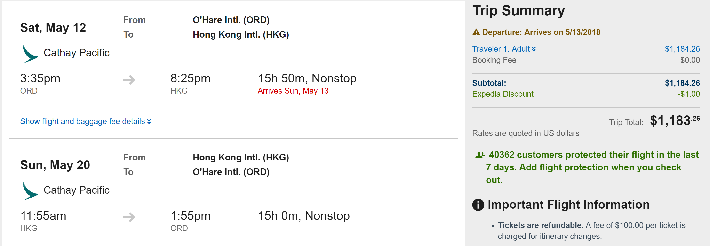 Chicago (ORD) to Hong Kong (HKG) for $1,183 round-trip on Cathay Pacific in premium economy: