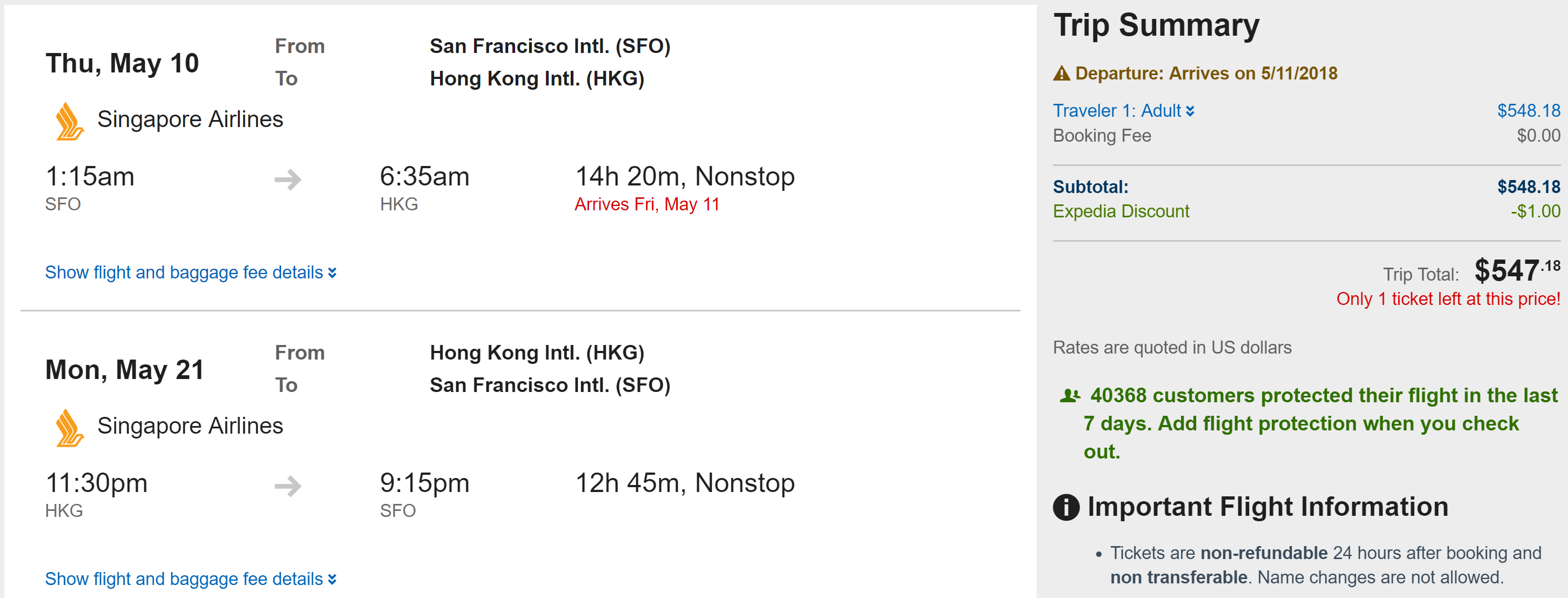 San Francisco (SFO) to Hong Kong (HKG) for $547 round-trip nonstop on Singapore: