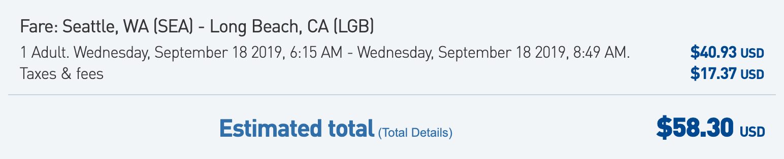 Seattle (SEA) to Long Beach, CA (LGB) for $59 one-way + nonstop: