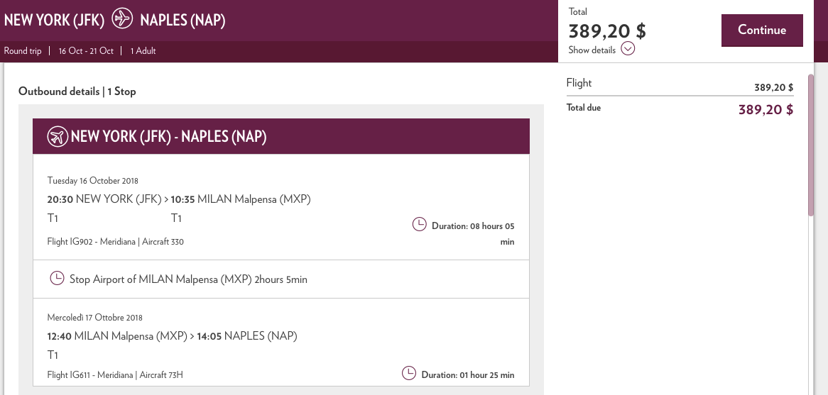 New York (JFK) to Naples (NAP) in October for $390 nonstop round-trip on Air Italy in Light Economy: