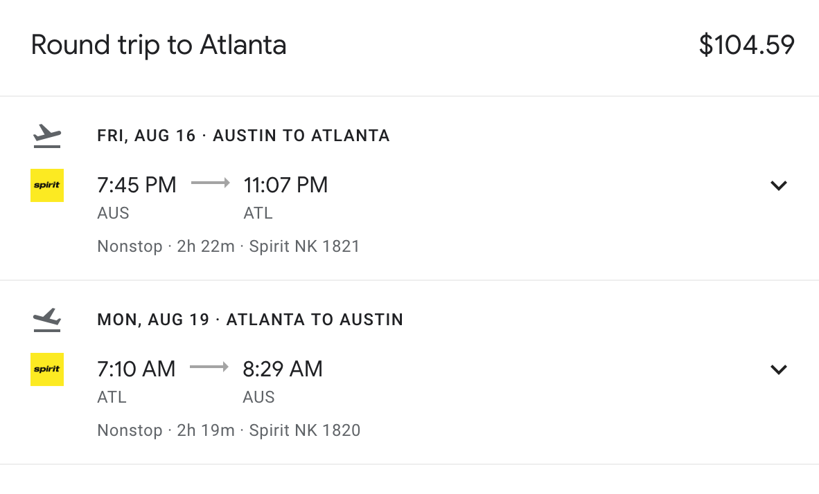 Austin (AUS) to Atlanta (ATL) for $105 round-trip on Spirit: