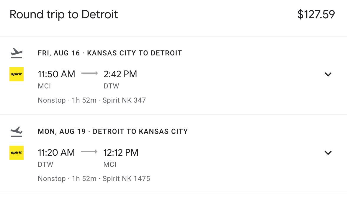 Kansas City (MCI) to Detroit (DTW) for $128 round-trip on Spirit: