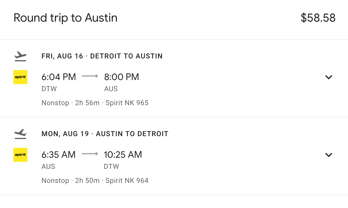 Detroit (DTW) to Austin (AUS) for $59 round-trip on Spirit: