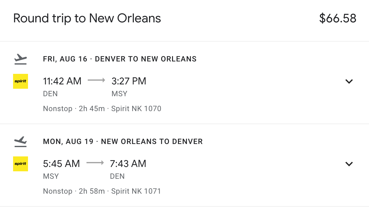 Denver (DEN) to New Orleans (MSY) for $67 round-trip on Spirit: