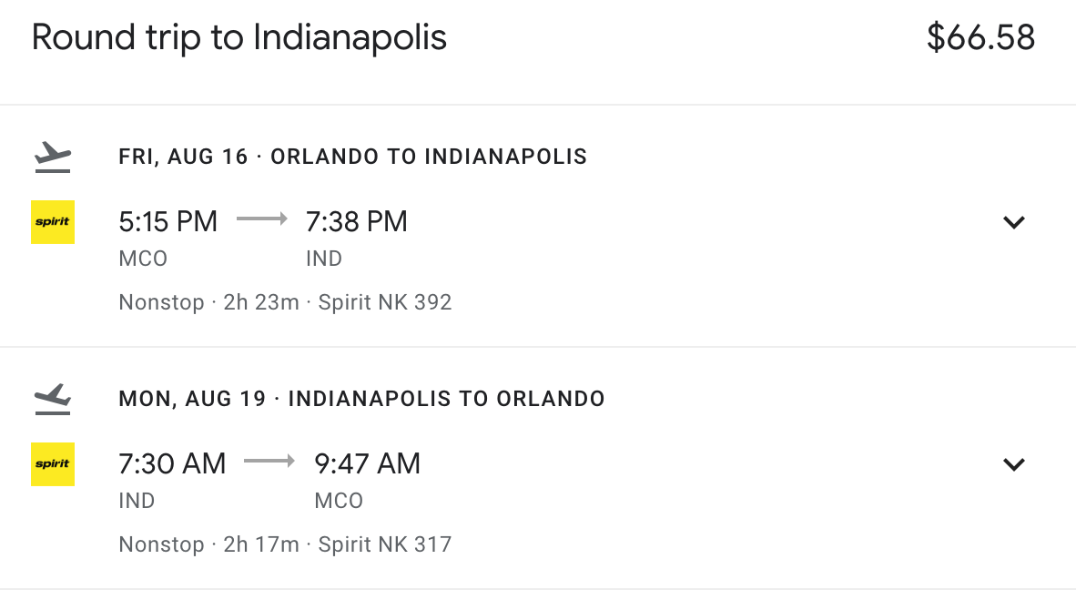 Orlando (MCO) to Indianapolis (IND) for $67 round-trip on Spirit: