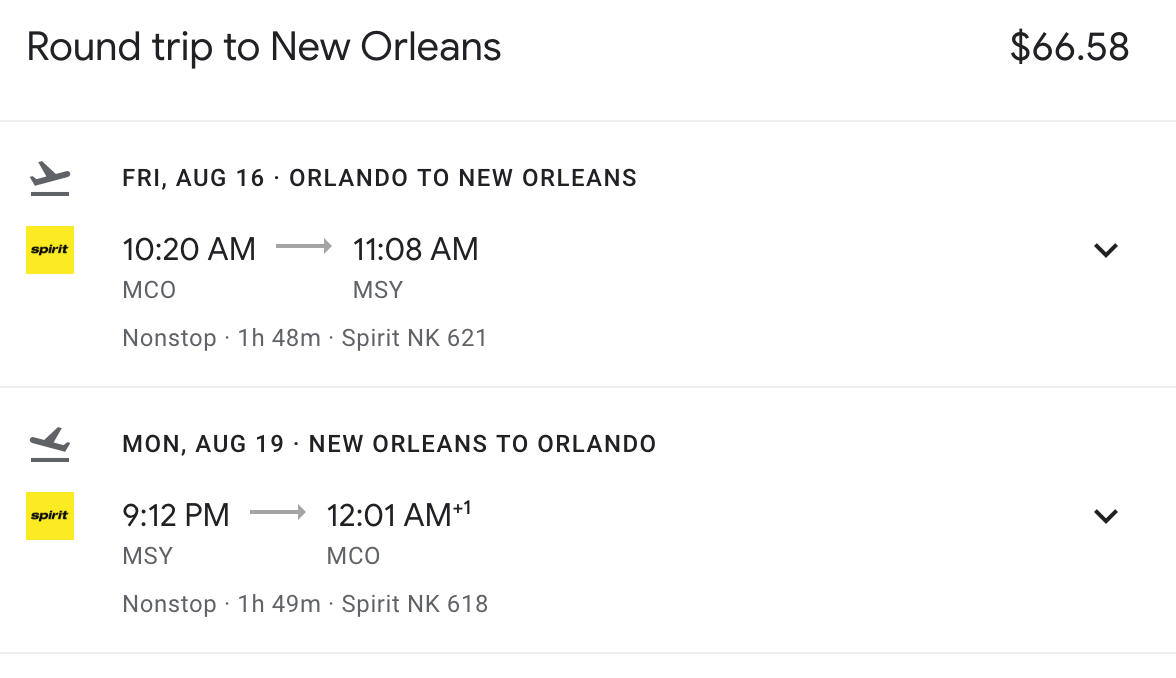 Orlando (MCO) to New Orleans (MSY) for $67 round-trip on Spirit: