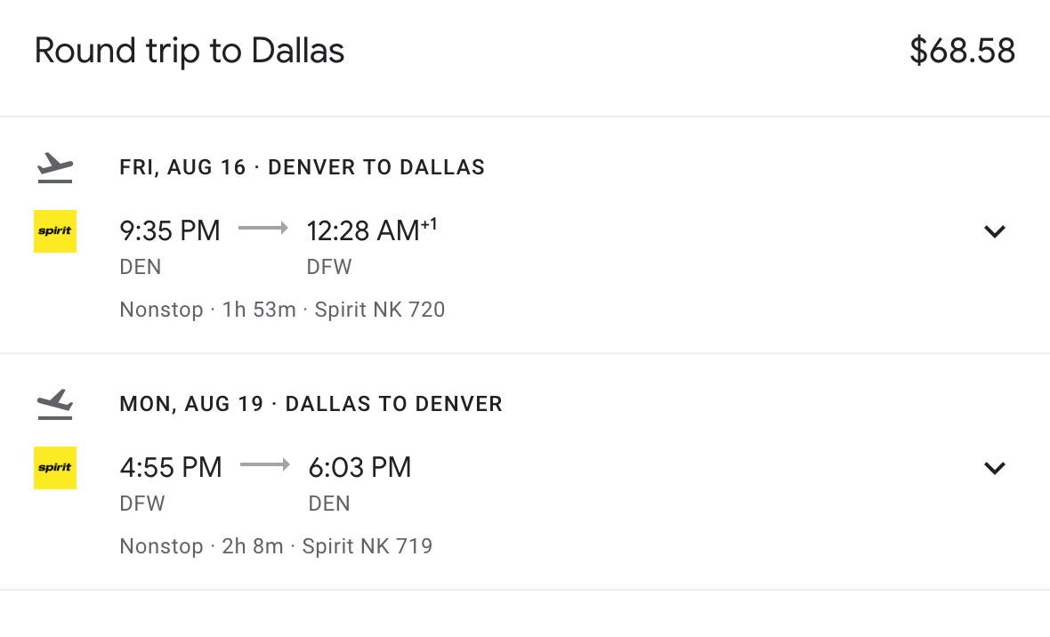 Denver (DEN) to Dallas (DFW) for $69 round-trip on Spirit: