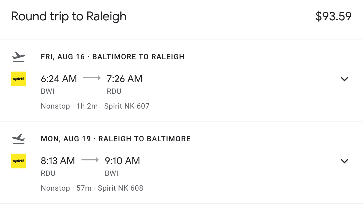 Baltimore (BWI) to Raleigh (RDU) for $94 round-trip on Spirit: