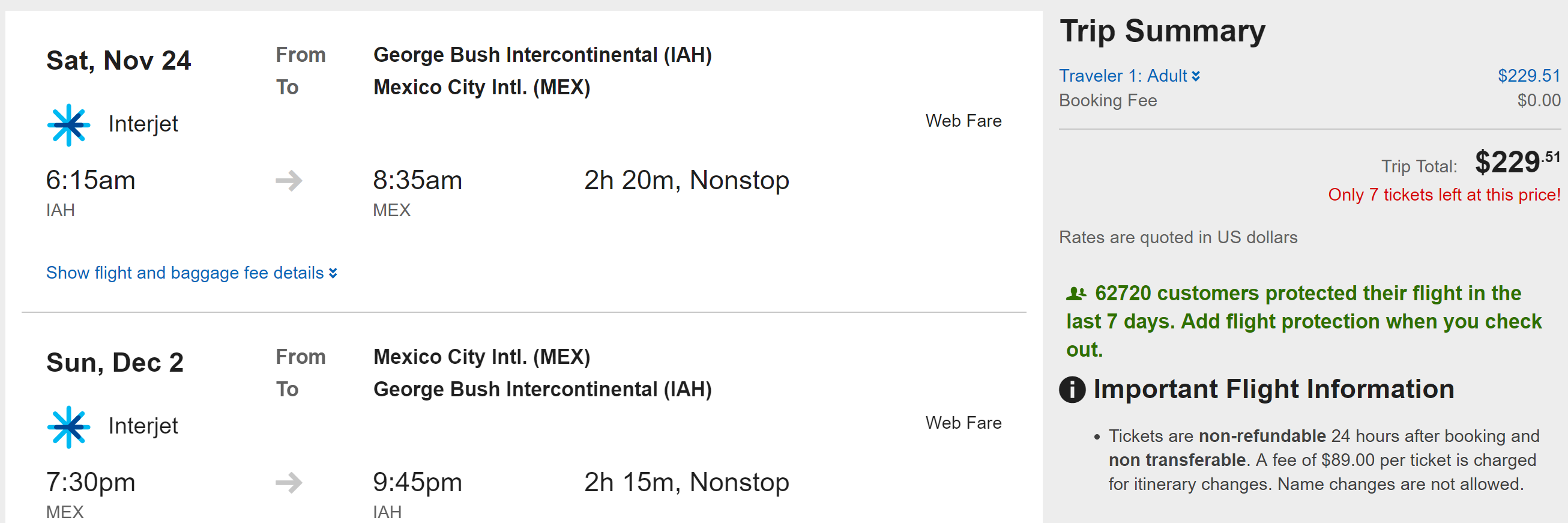 Houston Intercontinental (IAH) to Mexico City (MEX) on Interjet for $230 round-trip: