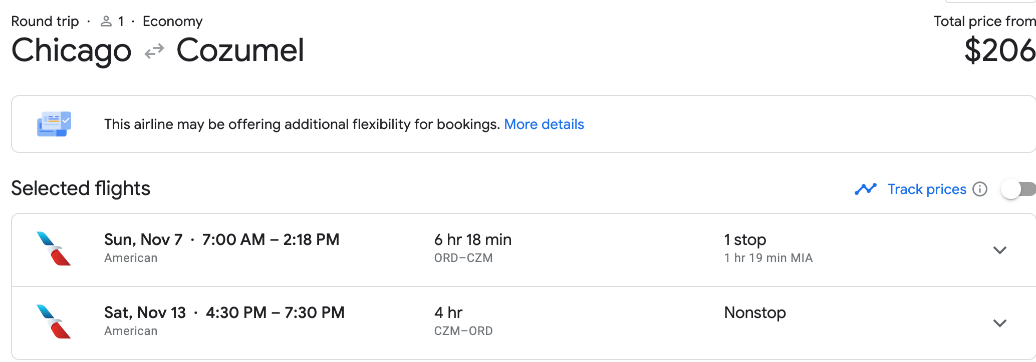 The fare cabin varies between basic economy and main cabin, which will affect whether the sale fare includes a carry-on bag or seat assignment. The below flight on American is among the lowest-priced in the batch, departing from Chicago's O'Hare International Airport (ORD) for just over $200 round-trip. It does stop briefly in Miami on the way to Cozumel (CZM), but it's only for an hour.