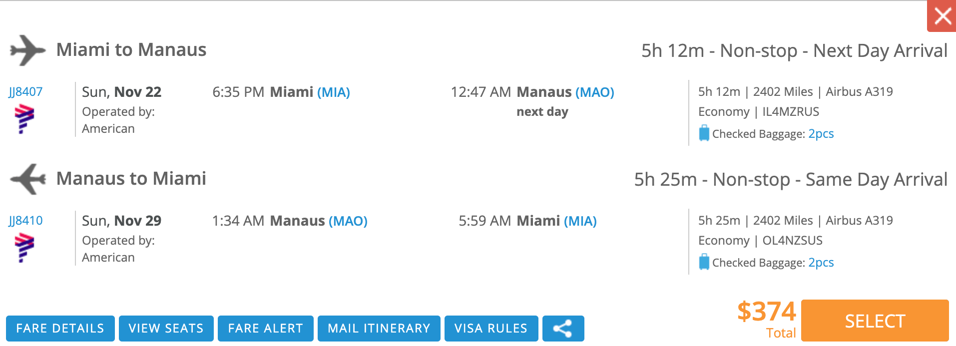 Miami (MIA) to Manaus (MAO) for $374 round-trip over Thanksgiving via Fareboom: