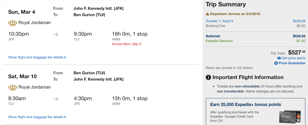 It's not every day we see a good deal to the Middle East, so this one's worth a look: Royal Jordanian is offering cheap round-trip fares with wide availability to Amman, Jordan (AMM) and Tel Aviv, Israel (TLV). These flights, departing from New York (JFK) and Chicago (ORD), are available from October through March, meaning you'll almost certainly be able to book a trip with dates that fit your schedule. Do your research on Google Flights and then you can complete booking through an OTA like Expedia or Orbitz, or directly through the airline.