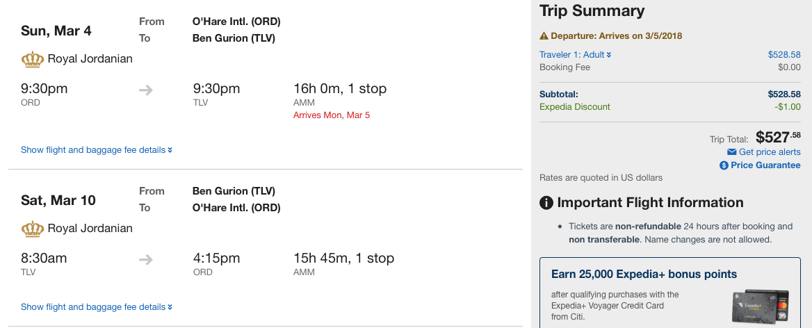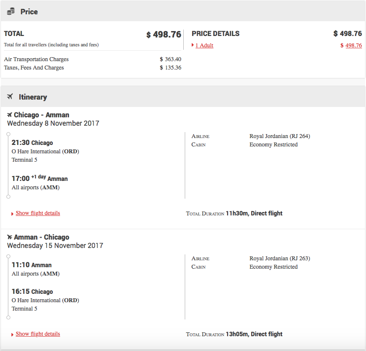 Chicago (ORD) to Amman (AMM) for $499 round-trip: