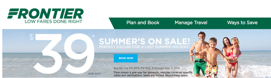 If you haven't been able to catch one of Frontier's special summer deals, now is your chance with one-way flights starting at $39. This deal includes flights from Atlanta (ATL); Chicago (ORD); Cleveland (CLE); Cincinnati (CVG); Denver (DEN); Miami (MIA); Las Vegas (LAS) and more for domestic, nonstop travel from August 6 to September 3, 2015.