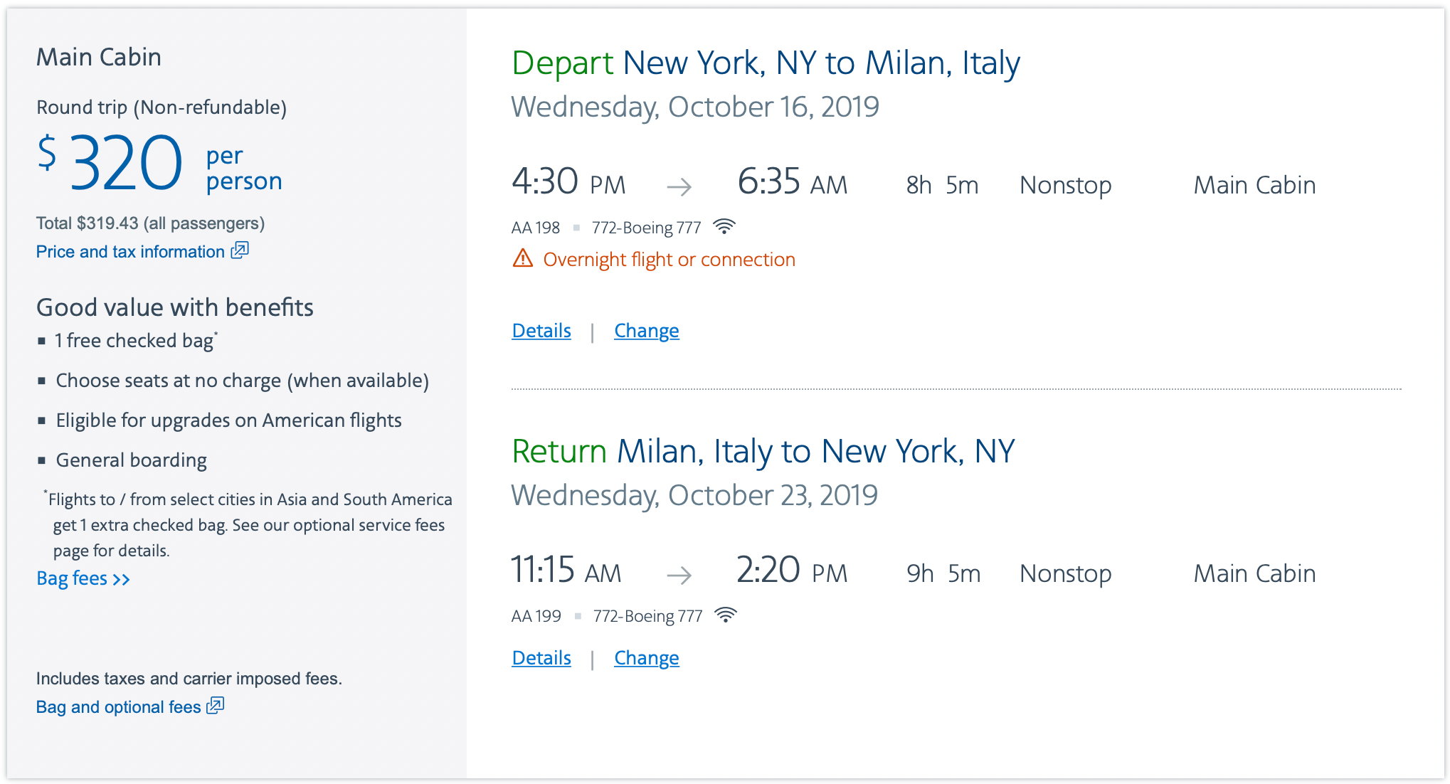New York (JFK) to Milan (MXP) for $320 round-trip in American main cabin: