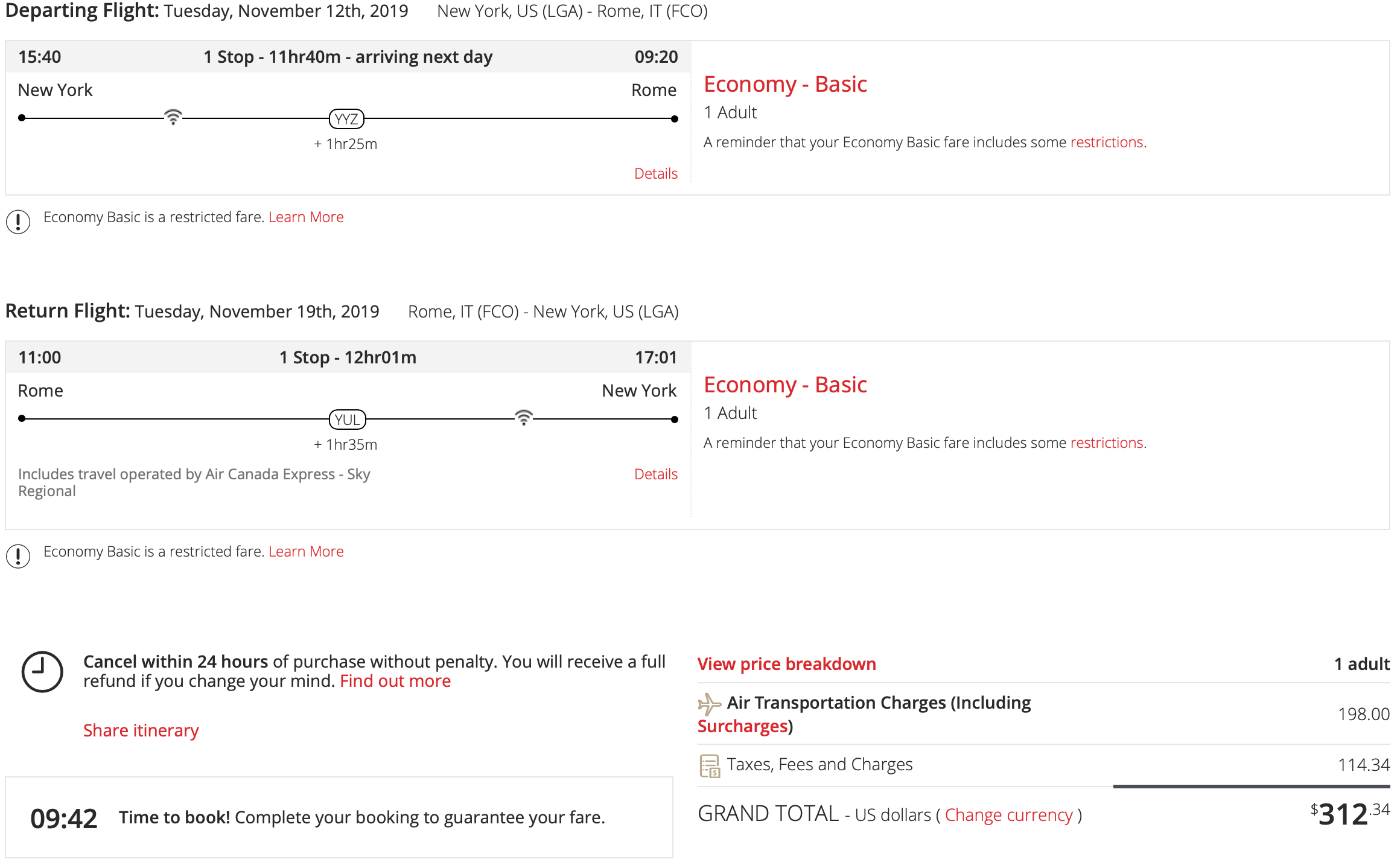 New York (LGA) to Rome (FCO) for $312 round-trip in Air Canada basic economy: