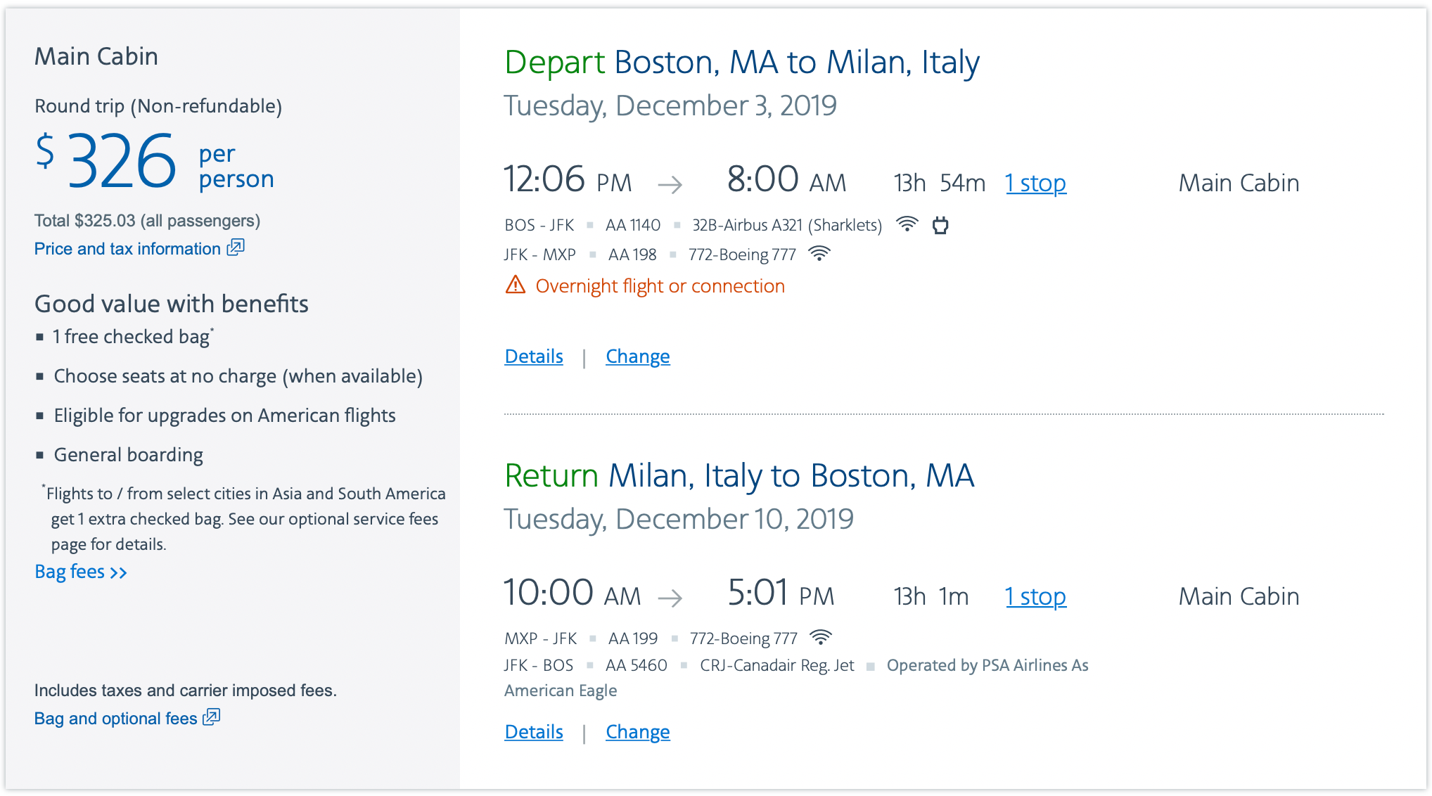 Boston (BOS) to Milan (MXP) for $326 round-trip in American main cabin: