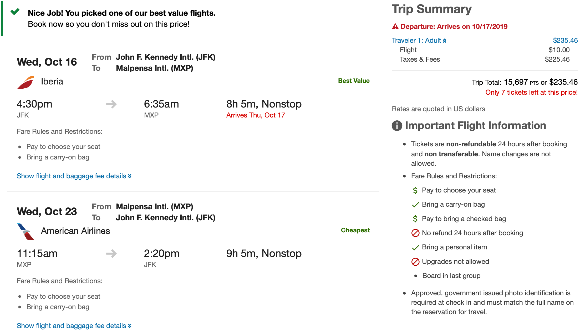 New York (JFK) to Milan (MXP) for $236 or 15,700 points round-trip in American basic economy: