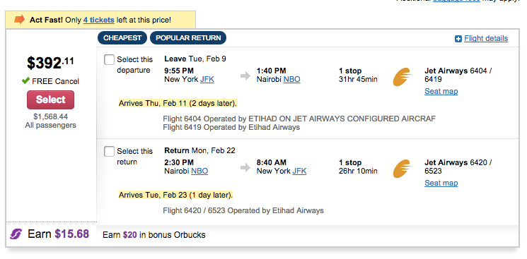 February 2016 - New York-Nairobi for $392.11 round-trip