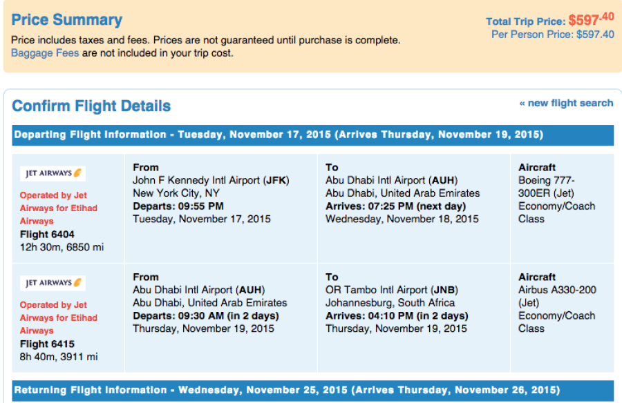 New York-Johannesburg for $597.40 round-trip in coach.