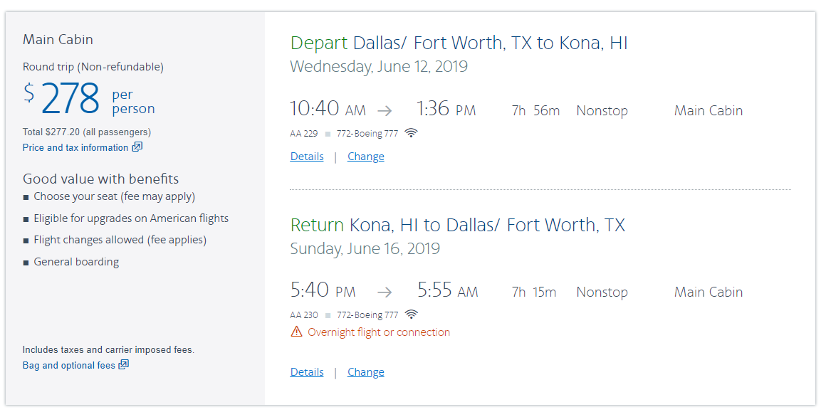 Dallas/Fort Worth (DFW) to Kona (KOA) for $277 round-trip nonstop in American Airlines Main Cabin: