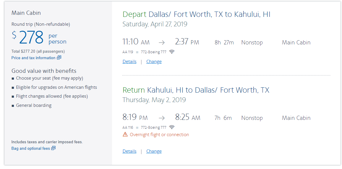 Dallas/Fort Worth (DFW) to Kahului (OGG) for $277 round-trip nonstop in American Airlines Main Cabin: