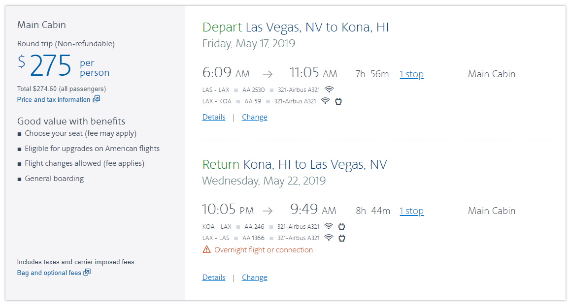 Las Vegas (LAS) to Kona (KOA) for $275 round-trip 1-stop in American Airlines Main Cabin: