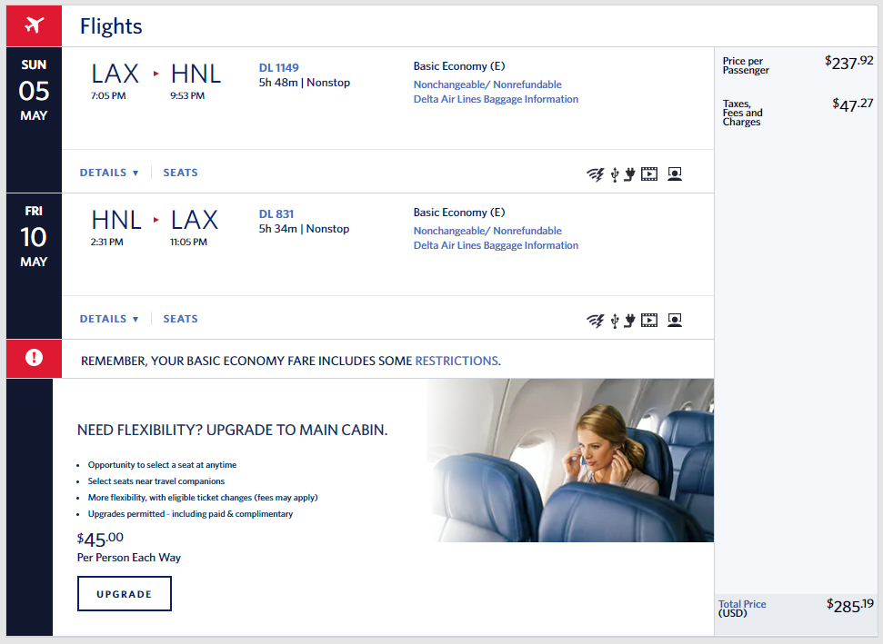 Los Angeles (LAX) to Honolulu (HNL) for $285 round-trip nonstop in Delta basic economy: