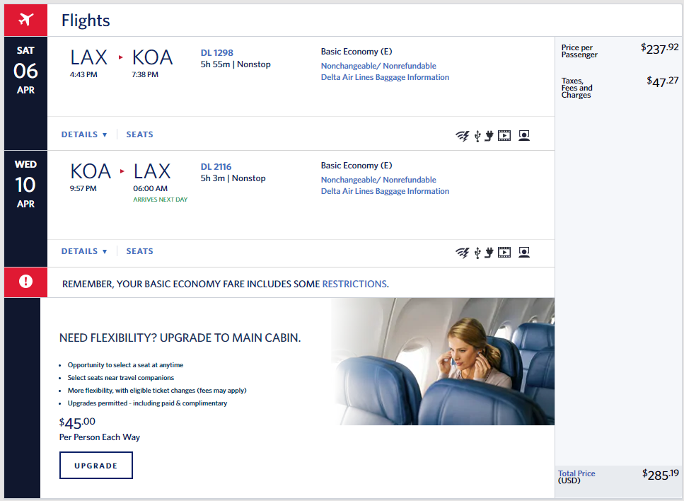 Los Angeles (LAX) to Kona (KOA) for $285 round-trip nonstop in Delta basic economy: