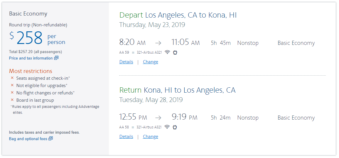 Los Angeles (LAX) to Kona (KOA) for $257 round-trip nonstop in American Airlines basic economy or $317 in Main Cabin: