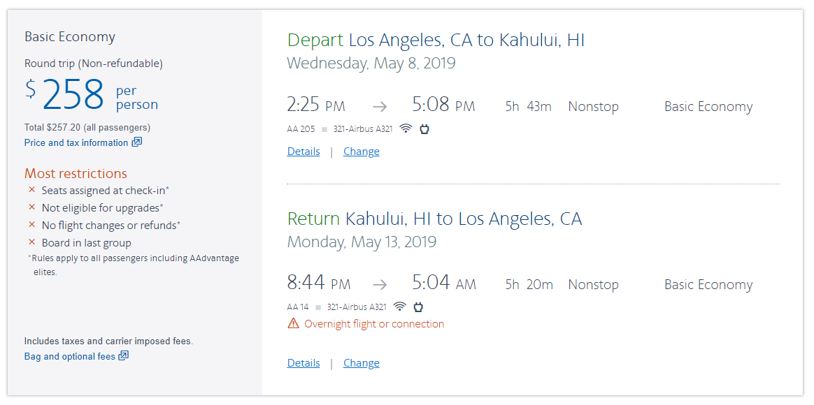 Los Angeles (LAX) to Kahului (OGG) for $257 round-trip nonstop in American Airlines basic economy or $317 in Main Cabin: