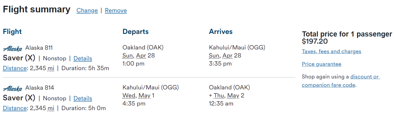Oakland (OAK) to Kahului, Maui (OGG) for $197 round-trip nonstop on Alaska Saver Fares: