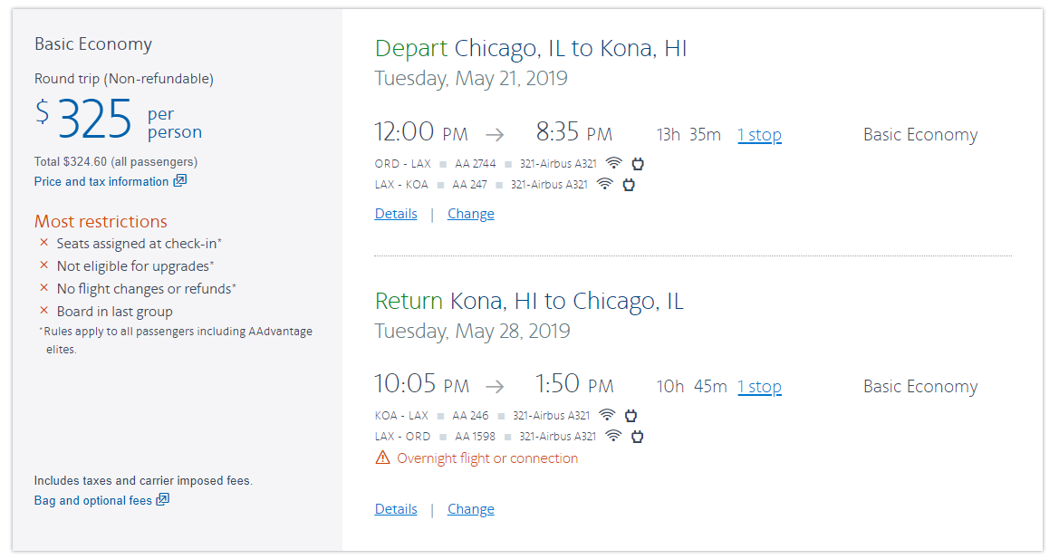 Chicago (ORD) to Kona (KOA) for $325 round-trip 1-stop in American Airlines basic economy or $415 in Main Cabin: