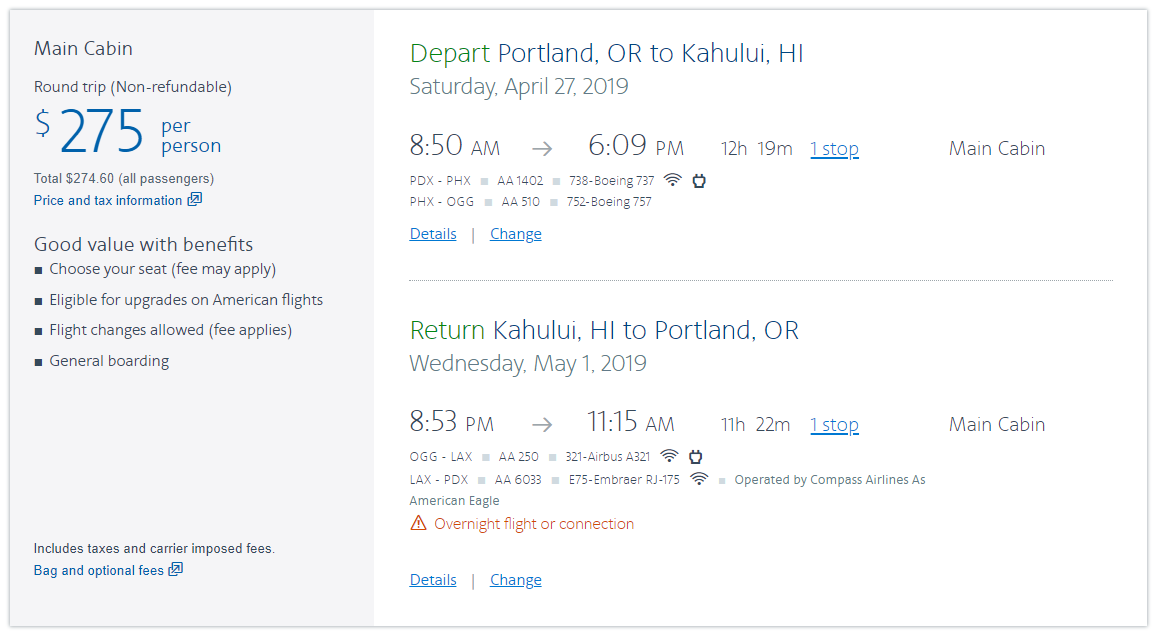 Portland (PDX) to Kahului (OGG) for $275 round-trip in American Airlines Main Cabin: