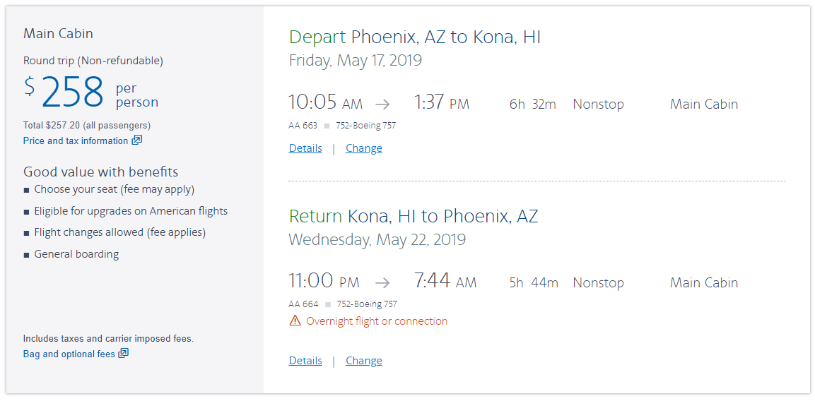 Phoenix (PHX) to Kona (KOA) for $257 round-trip nonstop in American Airlines Main Cabin: