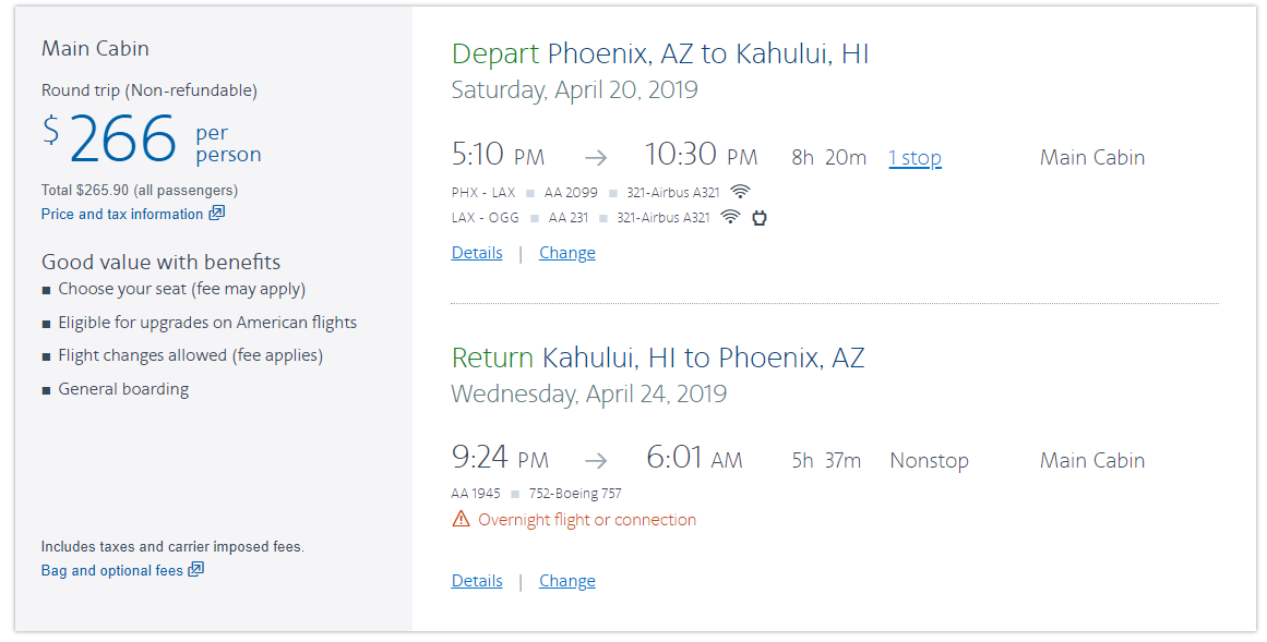 Phoenix (PHX) to Kahului (OGG) for $266 round-trip in American Airlines Main Cabin: