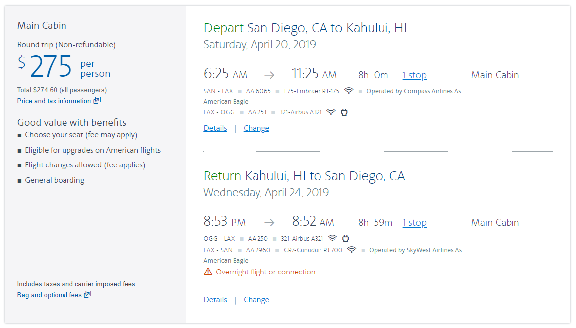 San Diego (SAN) to Kahului (OGG) for $275 round-trip 1-stop on American Airlines: