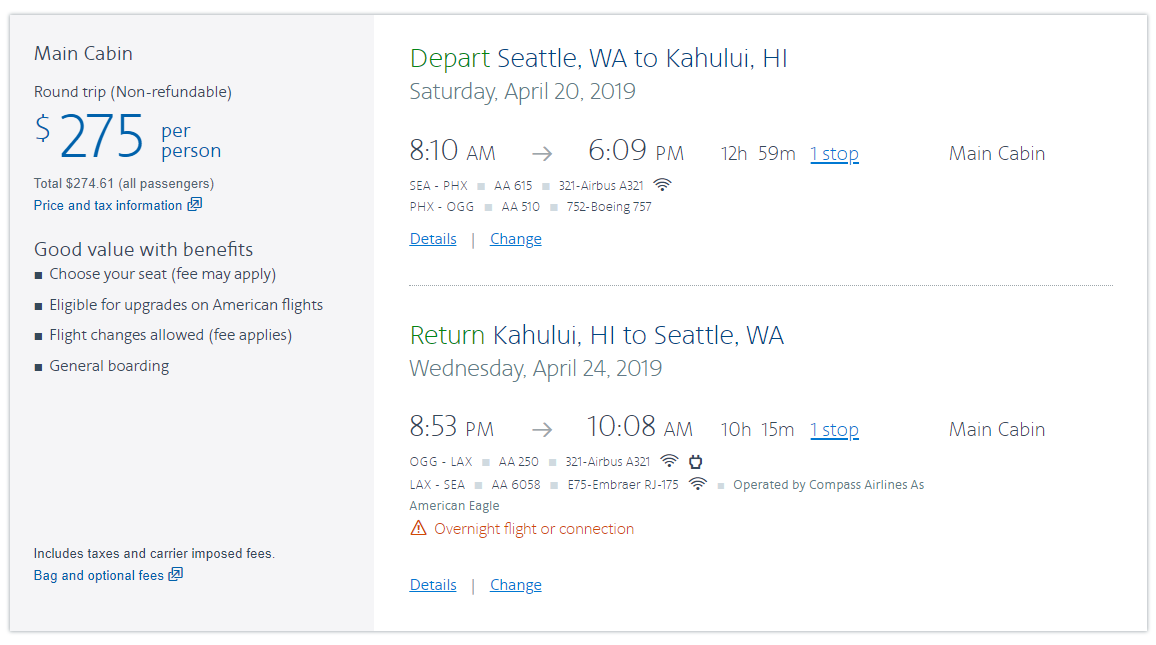 Seattle (SEA) to Kahului (OGG) for $275 round-trip in American Airlines Main Cabin: